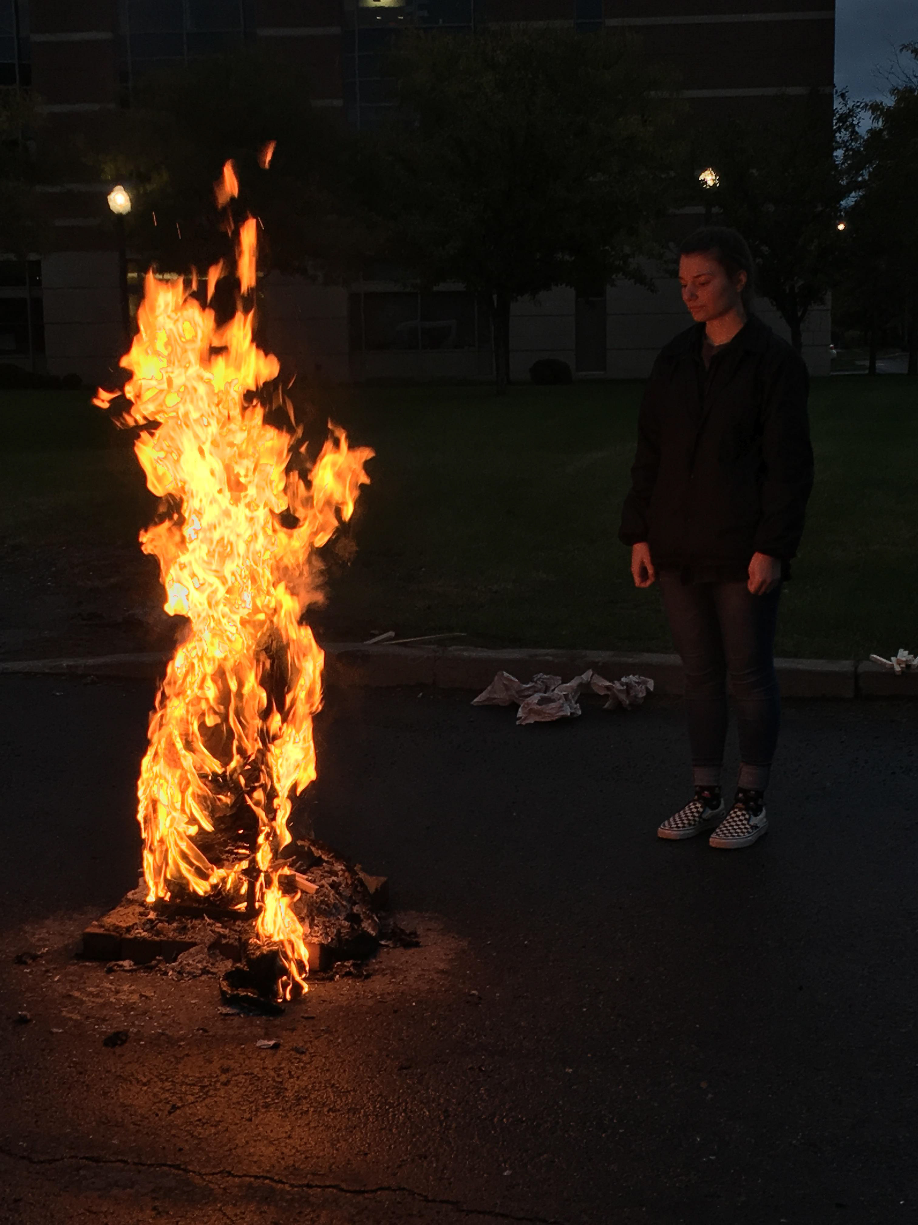 October 2018 | Fire Night performance | plywood, acrylic paint, spray paint, packing tape, newspaper, flour | 30" x 24" x 30"